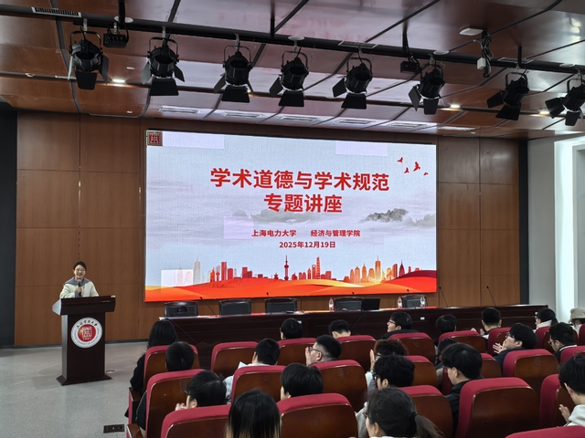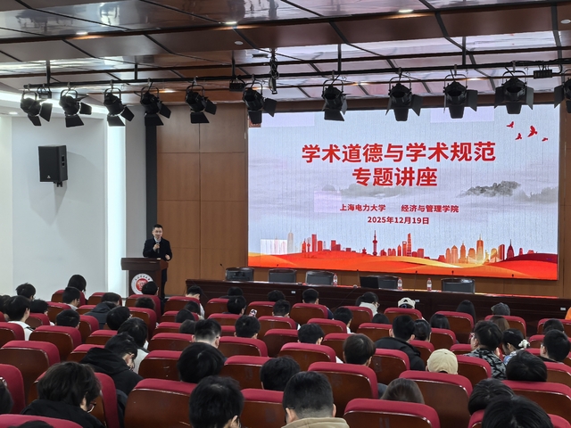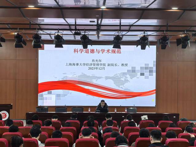 2025年12月19日为深化研究生与高年级本科生的学术道德建设,强化科研诚信意识,经管学院于临港校区学术楼103报告厅举办“科学道德与学术规范”专题讲座。本次讲座特邀上海海事大学经济管理学院副院长肖光年教授作专题报告,学院全体研一同学,本科生高年级同学共计150余人参与活动。讲座由学院党委副书记孟延新主持,副院长胡伟作主旨讲话。