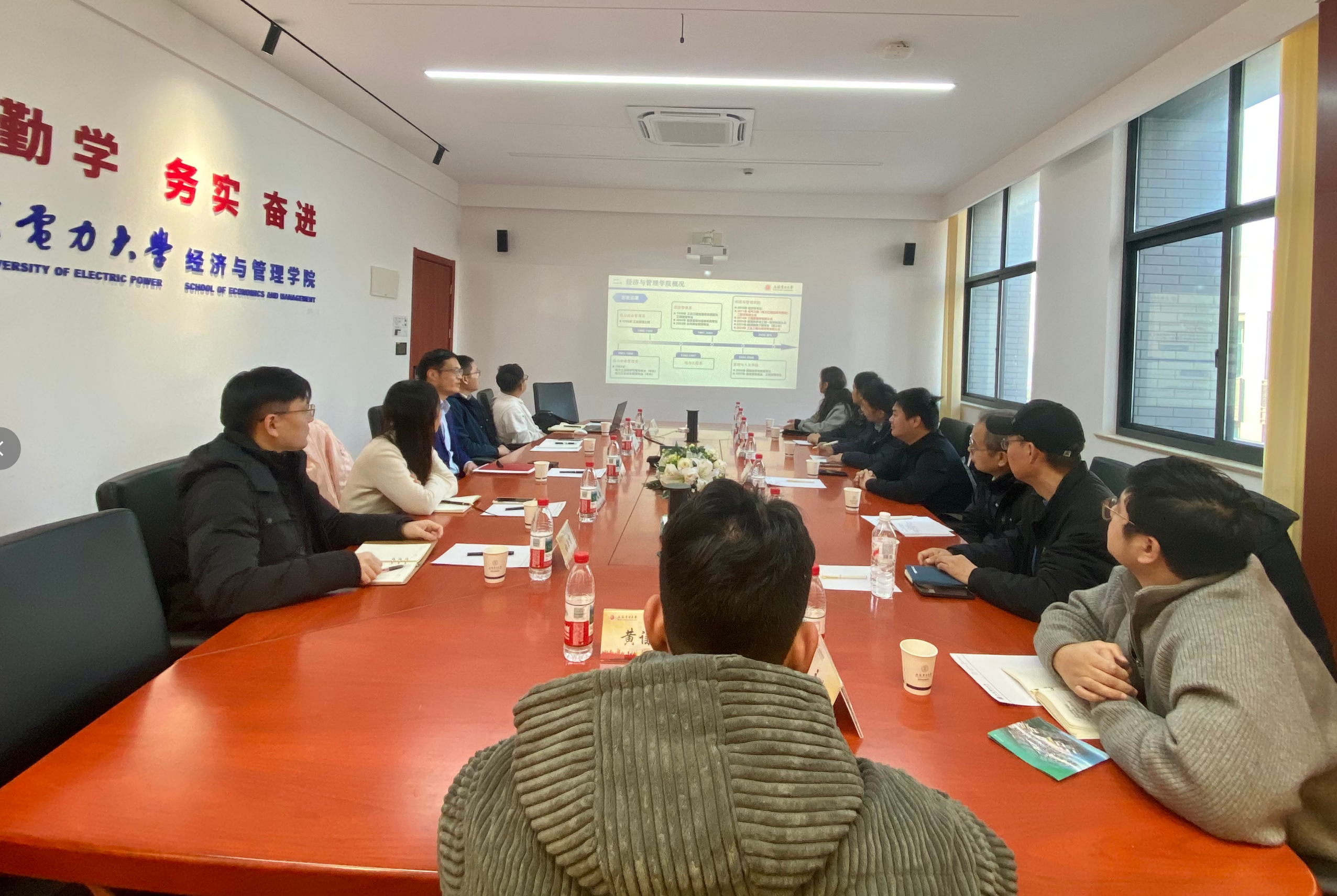2026年1月7日,中国电建集团江西省电力建设有限公司碳中和研究院副院长谢光辉一行8人莅临我院开展调研交流。经管学院党委书记潘华、院务秘书杨迎春、学院教师赵文会、杜玉吉等人出席座谈会。