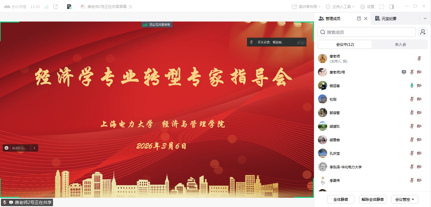 3月6日下午,经管学院组织召开了本科经济学专业转型升级研讨会。会议特邀华北电力大学经济与管理学院副院长李泓泽、长沙理工大学经济与管理学院副院长陈洁、上海路明星光智能科技有限公司业务总监吴迪和原天合富家能源股份有限公司电力交易业务负责人郭保智四位专家进行线上交流研讨。学院党委书记潘华、院长杜刚、院务秘书杨迎春、应用经济系主任胡道玖和经济学专业青年骨干教师参加会议。会议由杨迎春主持。